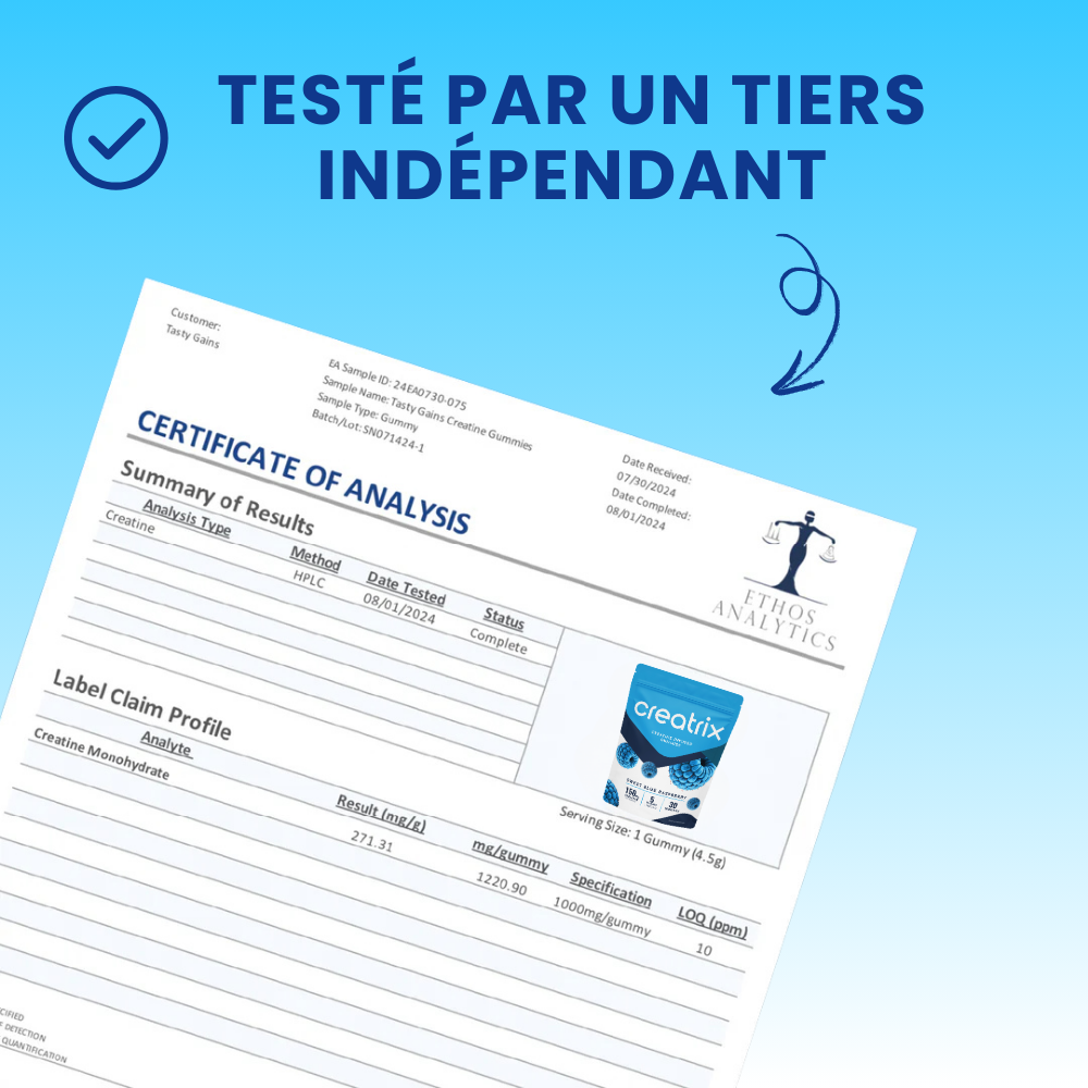 Chez Creatrix, nous ne faisons aucun compromis. Nos gommes à la créatine sont testées par un laboratoire tiers pour garantir la qualité, la sécurité et des résultats réels.